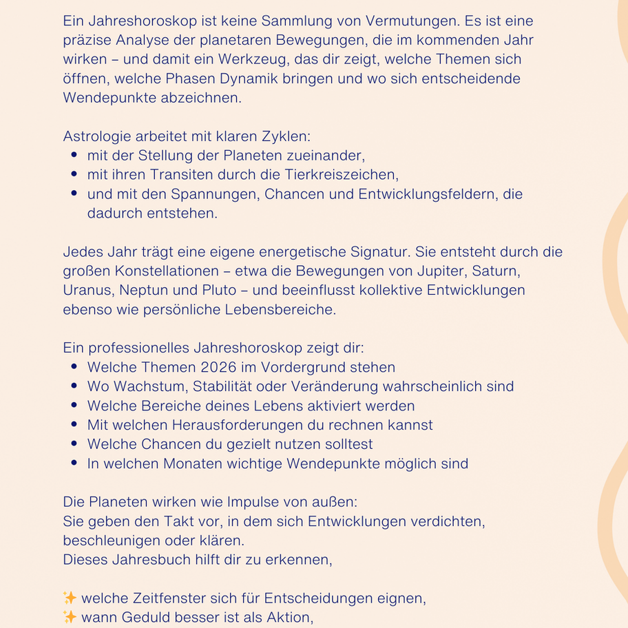 Mit deinem individuellen Jahreshoroskop findest du heraus, welche Themen, Chancen und Herausforderungen dein Jahr prägen werden: für mehr Klarheit, Orientierung und innere Ausrichtung.